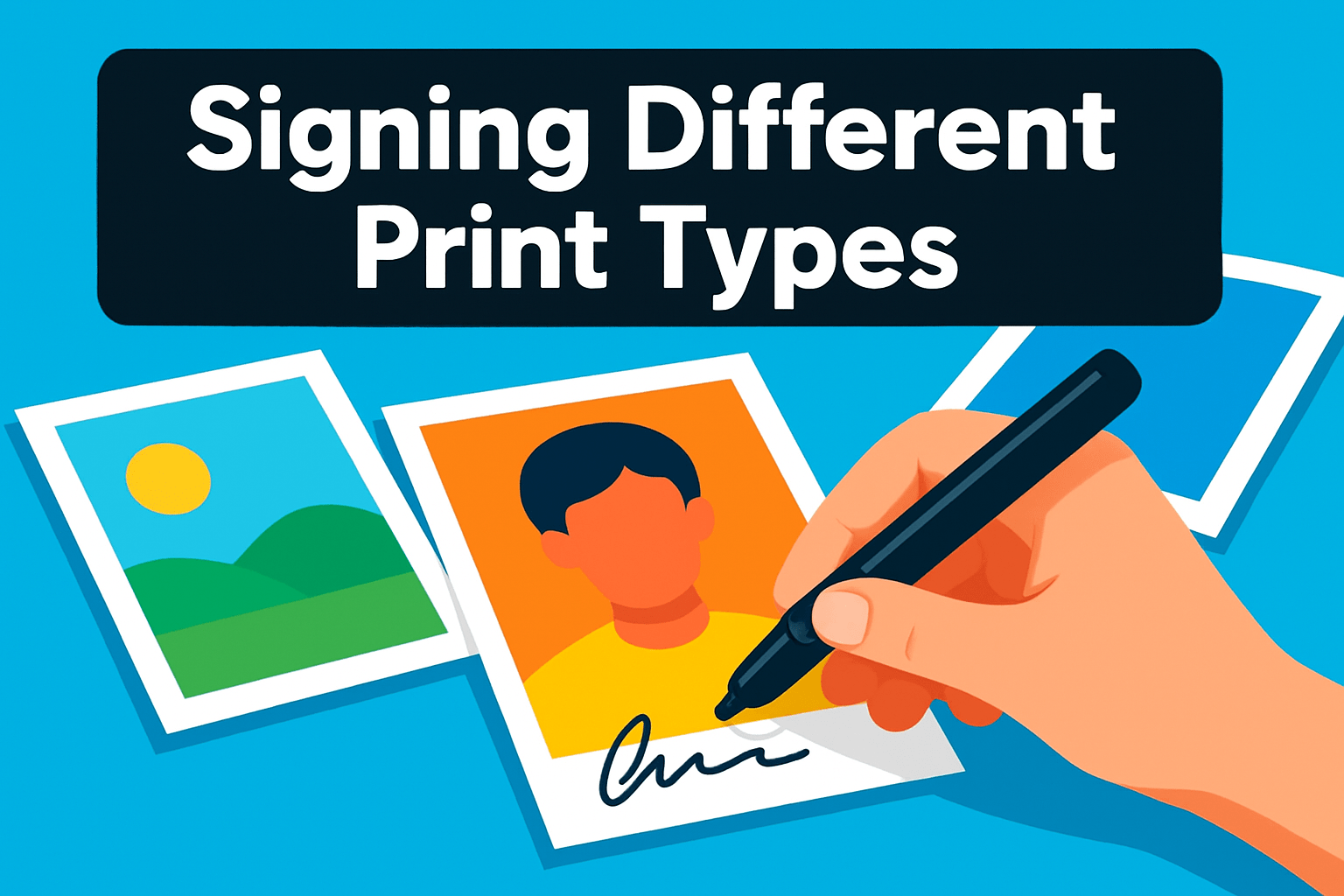 Use a pen formulated for the surface, keep hands clean, and let the ink dry fully before touching or stacking prints. Placing a protective sheet under your hand while signing can also help prevent transfer.